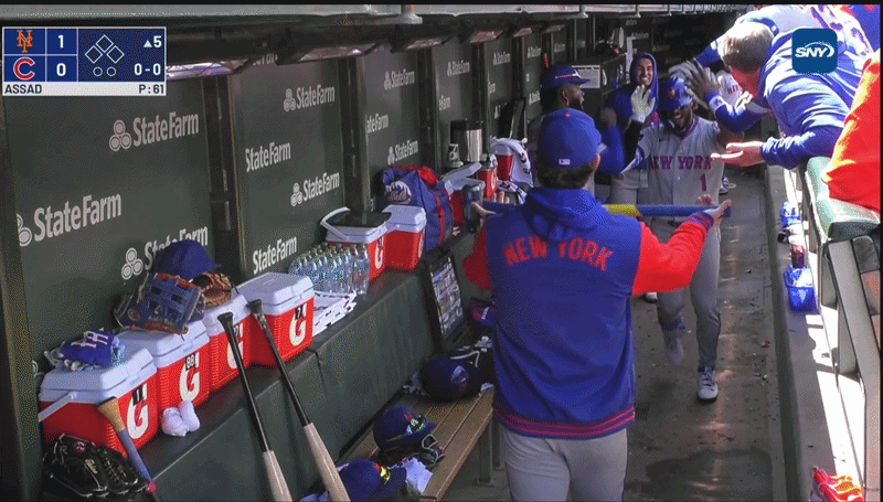 MJ Melendez homered to finish a long at-bat to begin the top of the fifth to make it 1-0 New York (NL). When he reached the dugout, he was handed a sledgehammer, which he used to hammer..the ground?